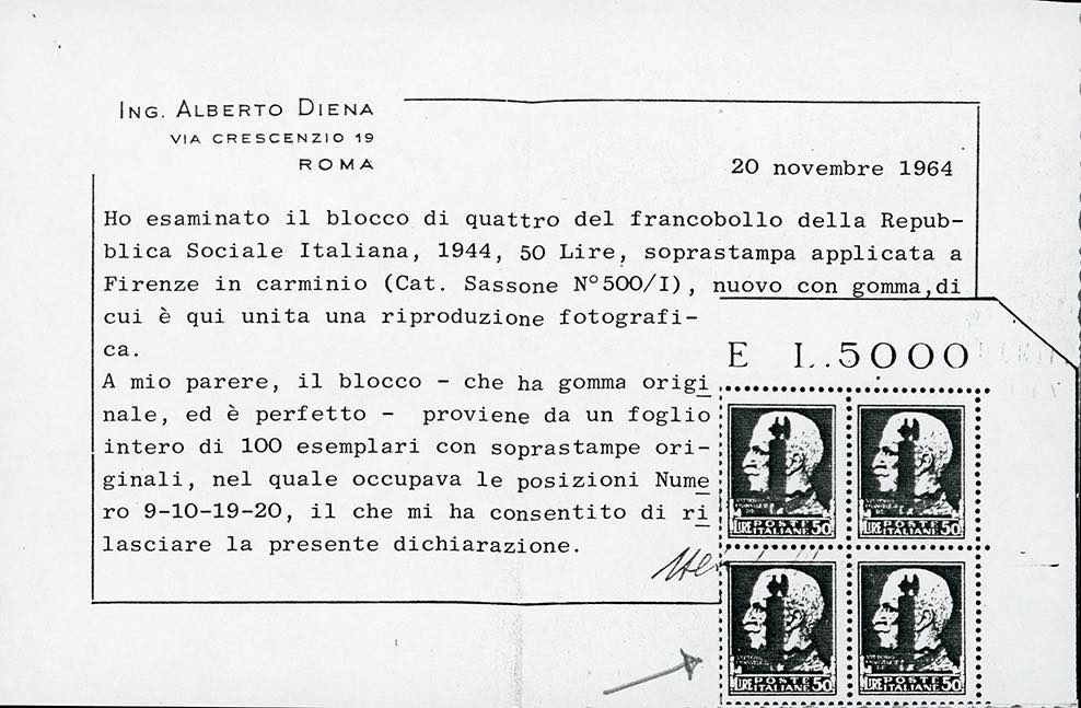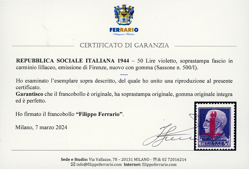 1944 - 50 lire soprastampato fascio in carminio lillaceo, emissione di Firenze (500/I), gomma originale integra, perfetto. Molto fresco. Fotocopia cert. A.Diena del blocco di provenienza, cert. Ferrario. Ex coll. Romano.