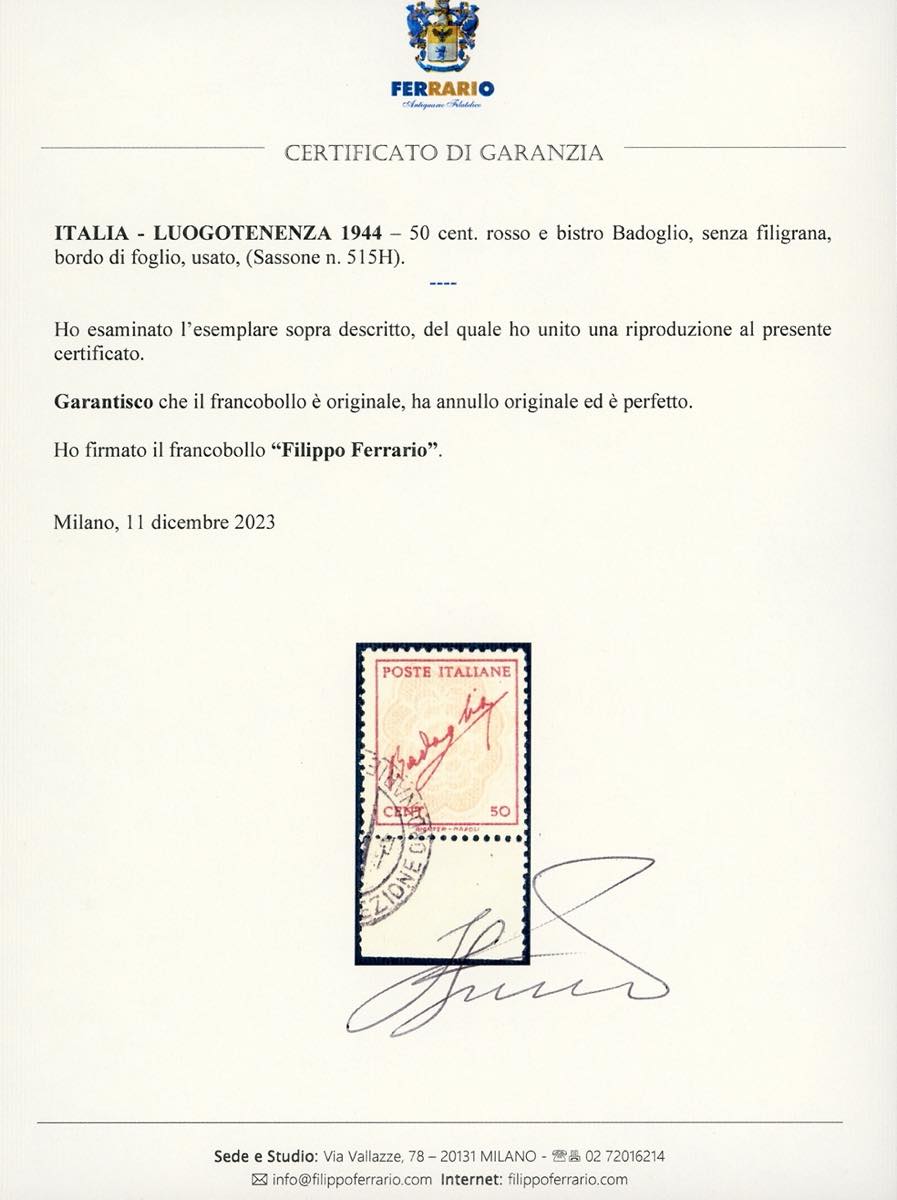 1944 - 50 cent. rosso e bistro Badoglio, senza filigrana (515H), bordo di foglio, usato, perfetto. A.Diena, cert. Ferrario.