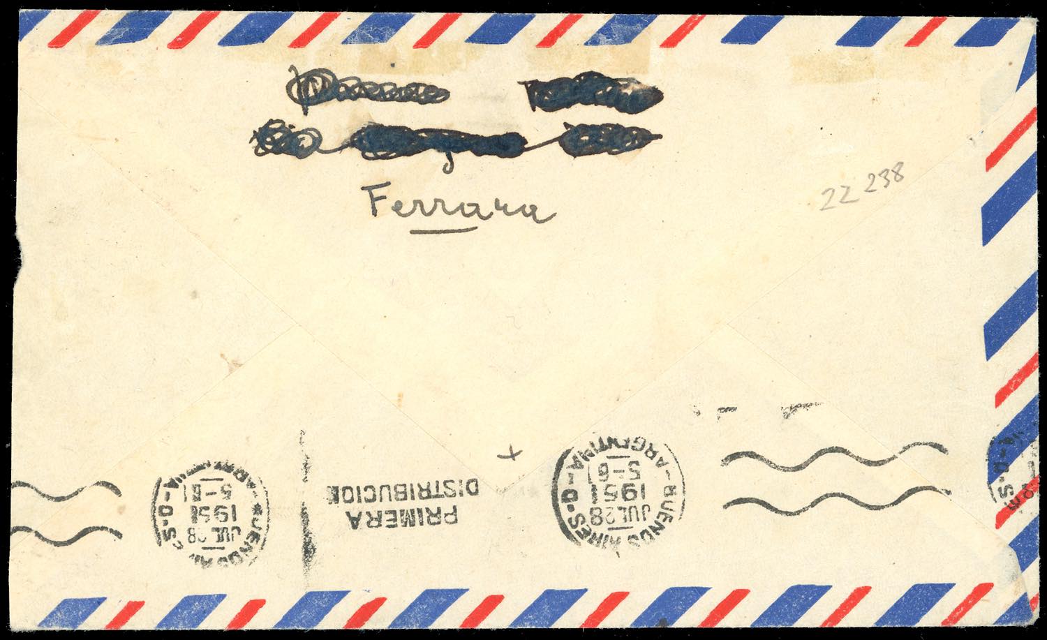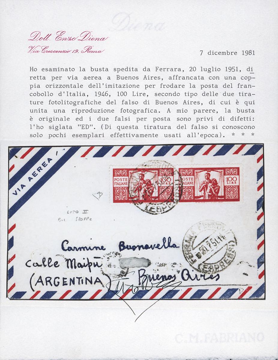 1951 - 100 lire Democratica, FALSO PER POSTA DI BUENOS AIRES, IV tiratura (F565C), coppia orizzontale, su aerogramma da Ferrara 20/7/1951 a Buenos Aires, bollo d'arrivo. Molto raro e di ottima qualità, senz'altro una delle migliori lettere note. Da esposizione. Ferrario, cert. Carraro ed E.Diena.