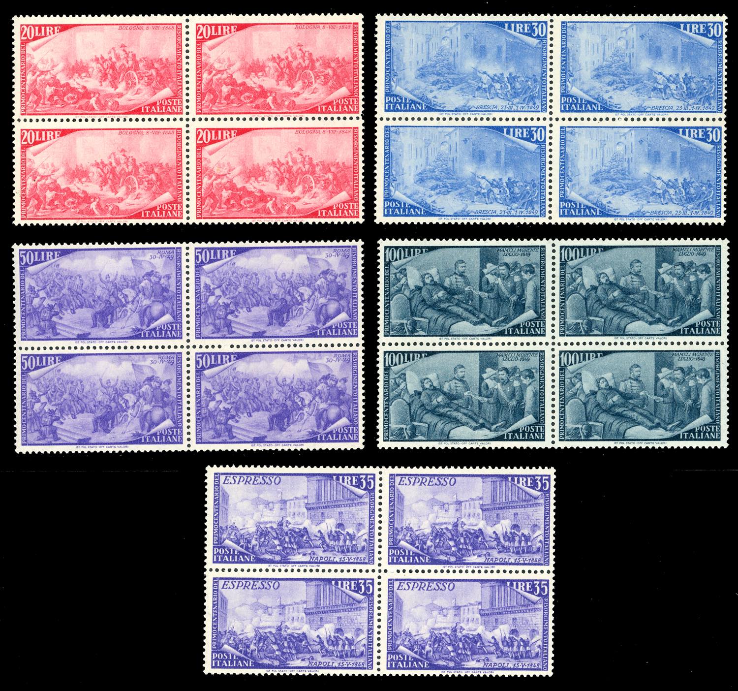 1948 - Risorgimento, serie completa (580/591+E), blocchi di quattro, gomma originale integra, perfetti e molto freschi. Ex coll. Romano.