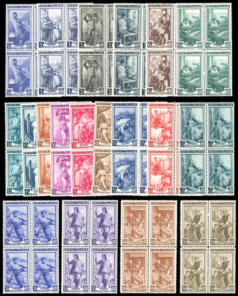 1950 - Lavoro filigrana ruota, serie completa (634/652), blocchi di quattro, nuovi, gomma originale integra, perfetti e ben centrati. Ottima qualità. Alti valori Ferrario.