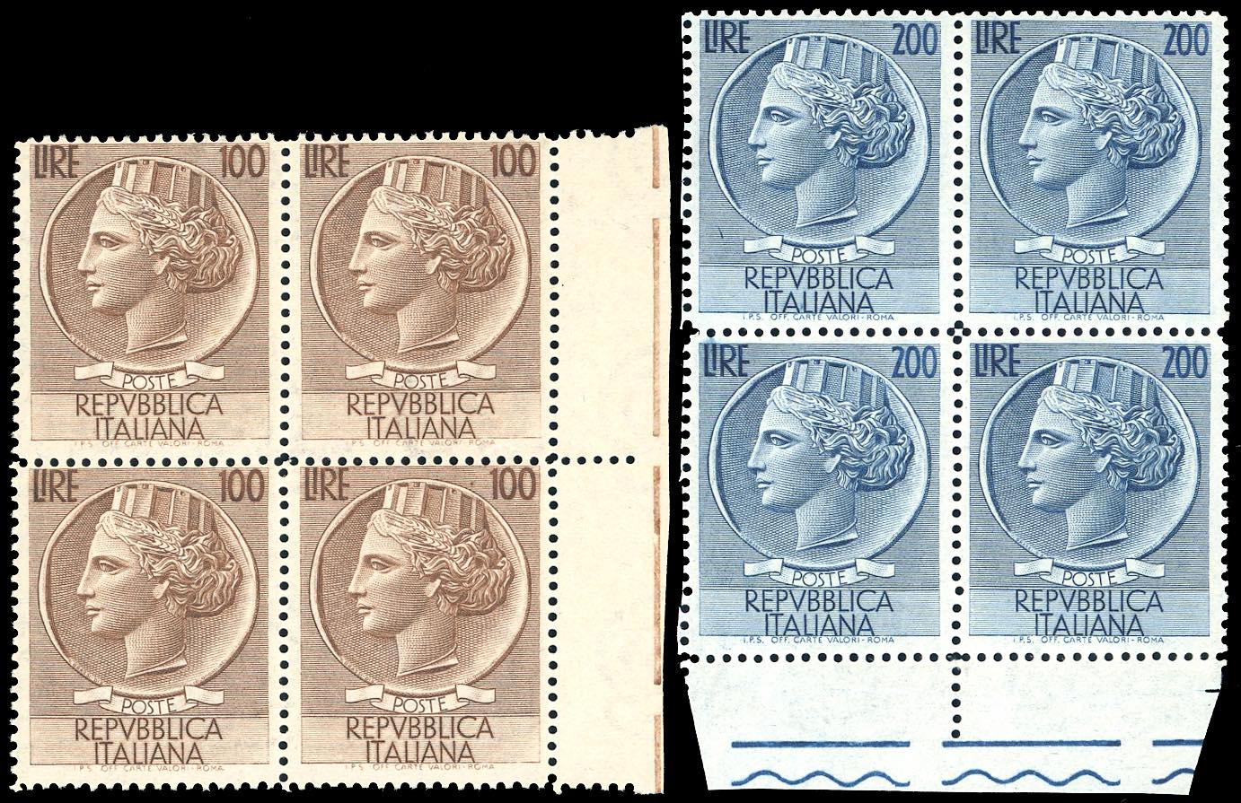 1954 - Turrita, filigrana ruota, serie completa (747/748), blocchi di quattro, bordo di foglio, gomma originale integra, perfetti e molto freschi. Ex coll. Romano.