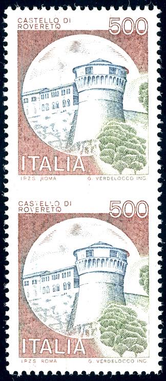 1980 - 500 lire Castelli (1522), coppia verticale non dentellata al centro, gomma originale integra, perfetta. Molto bella. Ferrario.