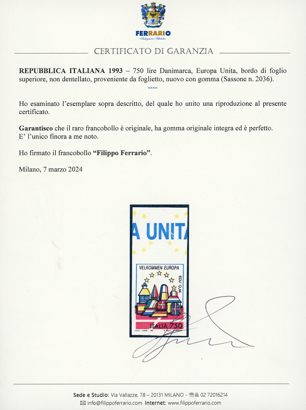 1993 - 750 lire Danimarca, Europa Unita, non dentellato, proveniente da foglietto (2036), nuovo, bordo di foglio superiore, gomma originale integra, perfetto. Rarissimo, probabilmente unico e non catalogato. Cert. Ferrario.