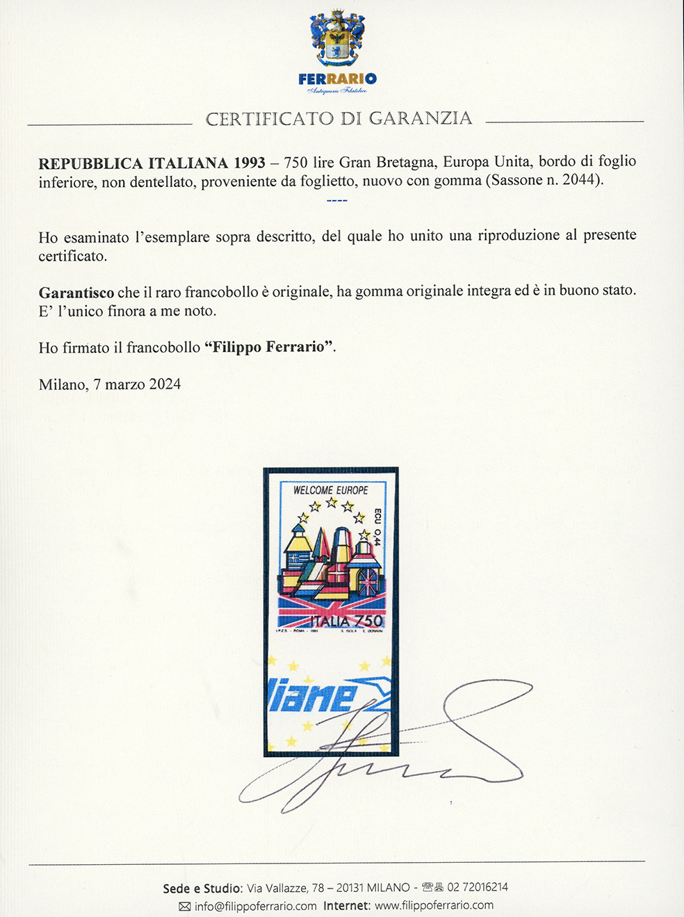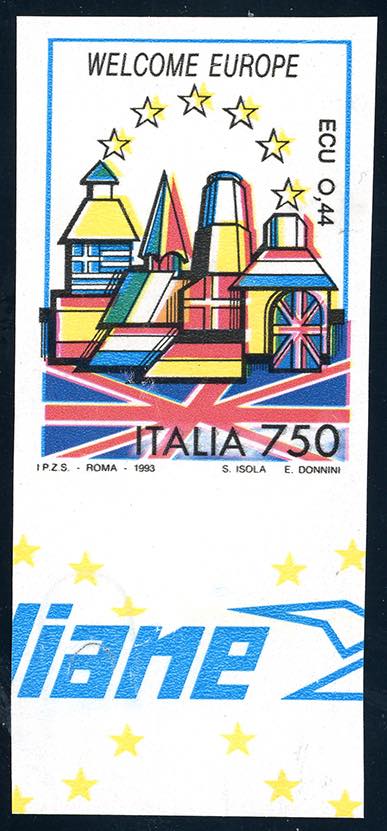 1993 - 750 lire Gran Bretagna, Europa Unita, non dentellato, proveniente da foglietto (2044), nuovo,bordo inferiore di foglio, gomma originale integra, buono stato. Rarissimo, probabilmente unico e non catalogato. Cert. Ferrario.