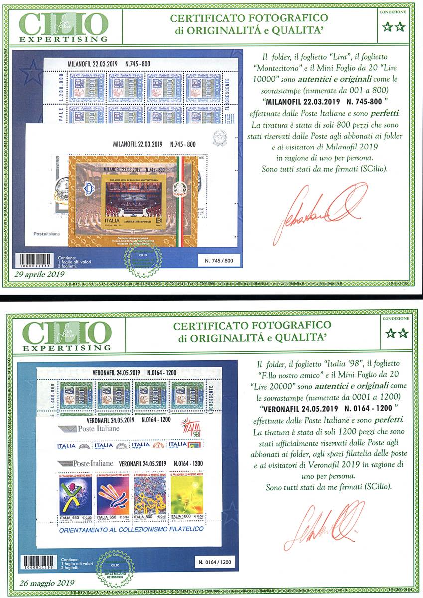 2019 - Folder "Valori nel tempo" di Milanofil e Veronafil, contenenti i sei foglietti soprastampati e numerati (84,108,19,99,nota minifogli 1442A e 1442B), gomma originale integra, perfetti. Molto rari, tiratura 800 esemplari del primo e 1200 esemplari del secondo. Due cert. Cilio. Ex coll. Romano.