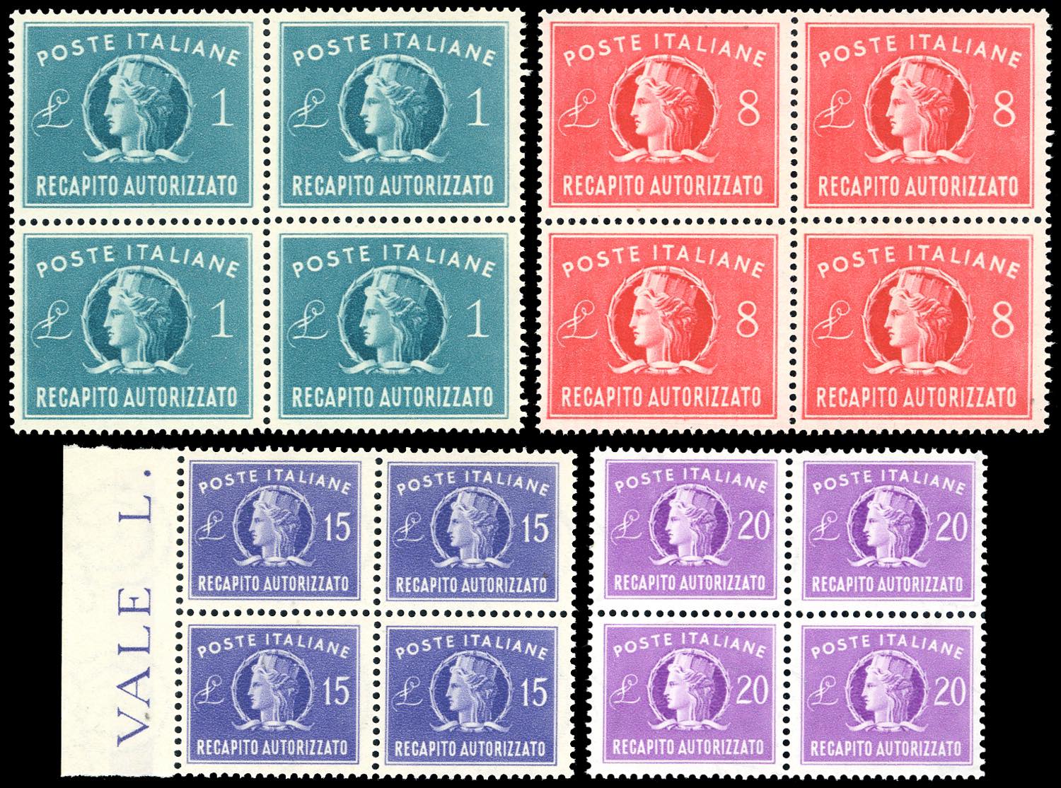 1947/52 - Le prime due emissioni, filigrana ruota (8/9,10/11), blocchi di quattro, nuovi, gomma originale integra, perfetti. Ottima qualità. Ferrario.