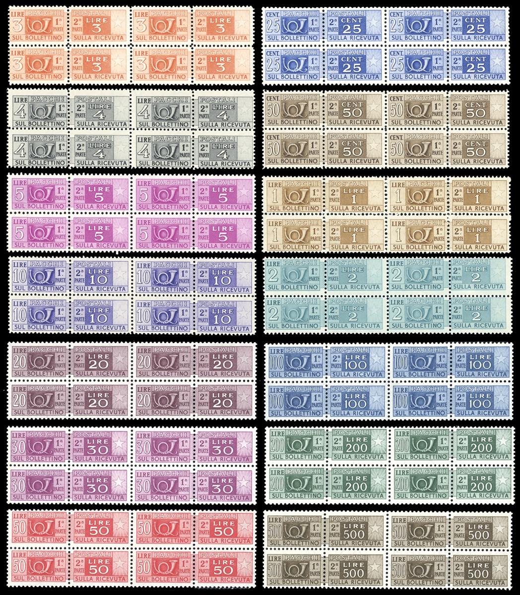 1946/51 - Serietta di 14 valori, filigrana ruota (66/78,80), blocchi di quattro, nuovi, gomma originale integra, perfetti. Molto freschi. ... Read more