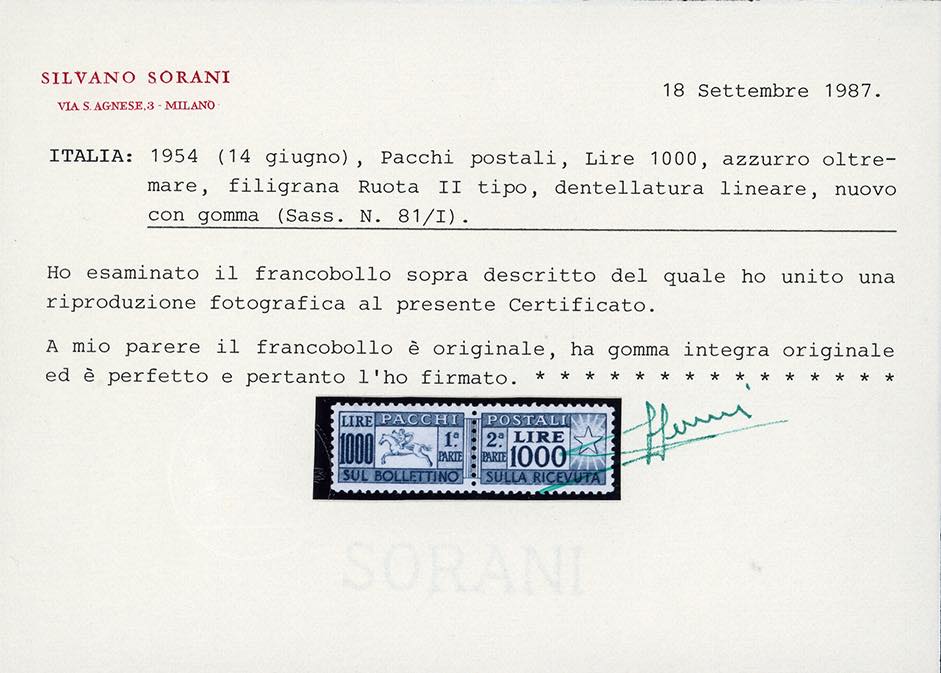 1954 - 1.000 lire Cavallino, filigrana ruota, dent. Lineare (81/I), ottima centratura, gomma originale integra, perfetto e molto bello. Cert. Sorani. Ex coll. Romano.