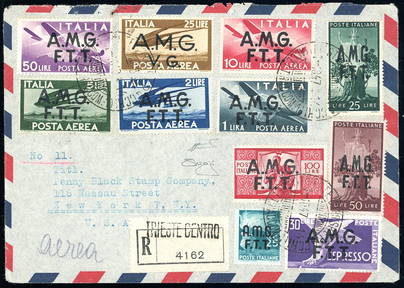 1947 - Democratica, soprastampa su due righe, i francobolli di posta ordinaria, posta aerea, espressi e 1 lira recapito autorizzato (1/8,10,12/14,16/17,A1/6,E1,E3,RA1), perfetti, in affrancatura recto/verso su aerogramma raccomandato FDC da Trieste 1/10/1947, primo giorno d'emissione, per gli Stati Uniti. Ferrario.