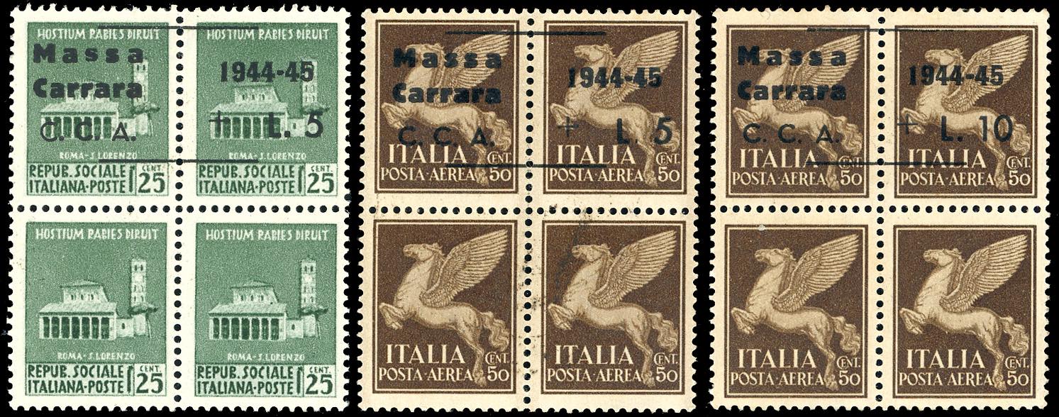 MASSA CARRARA 1945 - Serie completa di 3 valori, come sempre in quartina (CEI n.1/3, Orlandini n.1/3 € 6.000), nuovi, gomma originale integra, perfetti. Molto belli e non comuni. Ferrario, cert. Raybaudi.