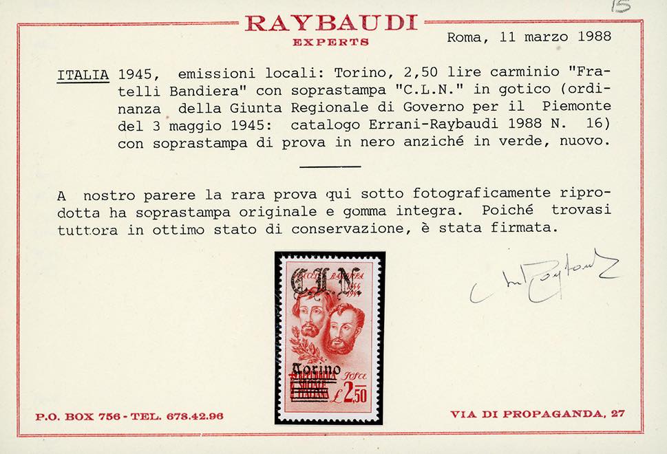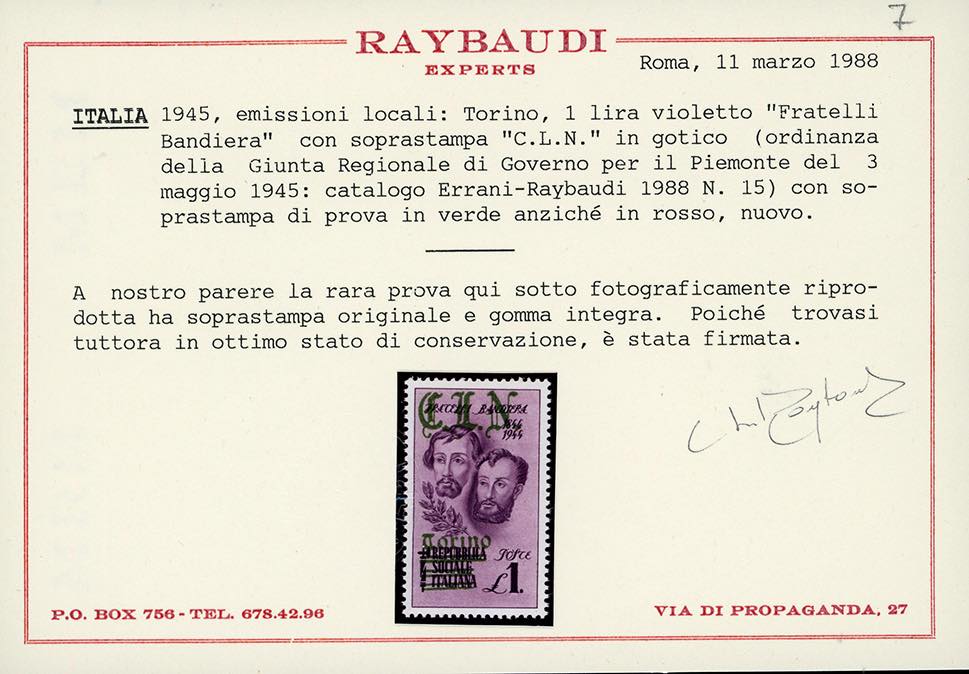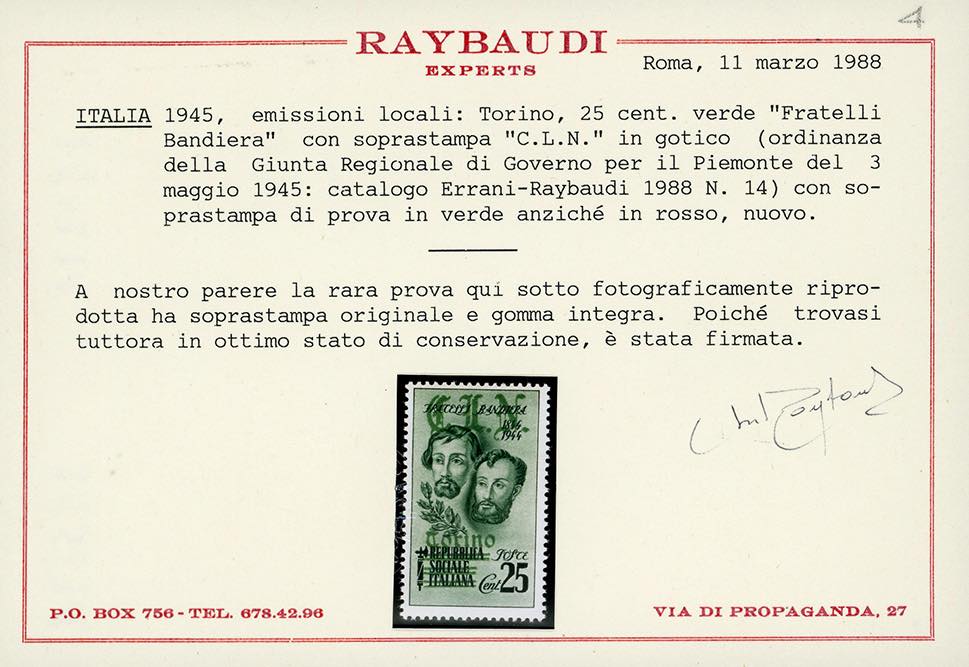 TORINO 1945 - Fratelli Bandiera, 25 e 50 cent. soprastampa verde, anziché rossa, 2,50 lire due esemplari, uno con soprastampa rossa, anziché verde, l'altro con soprastampa nera, anziché verde (Errani Raybaudi vedi nota,CEI P32/P34, UNIFICATO 14e,15e,16f,16g), nuovi, gomma originale integra, perfetti. Allestiti a titolo di prova. Rarissimi, pochi esemplari esistenti, probabilmente tiratura 50. Cert. Ferrario e Raybaudi.