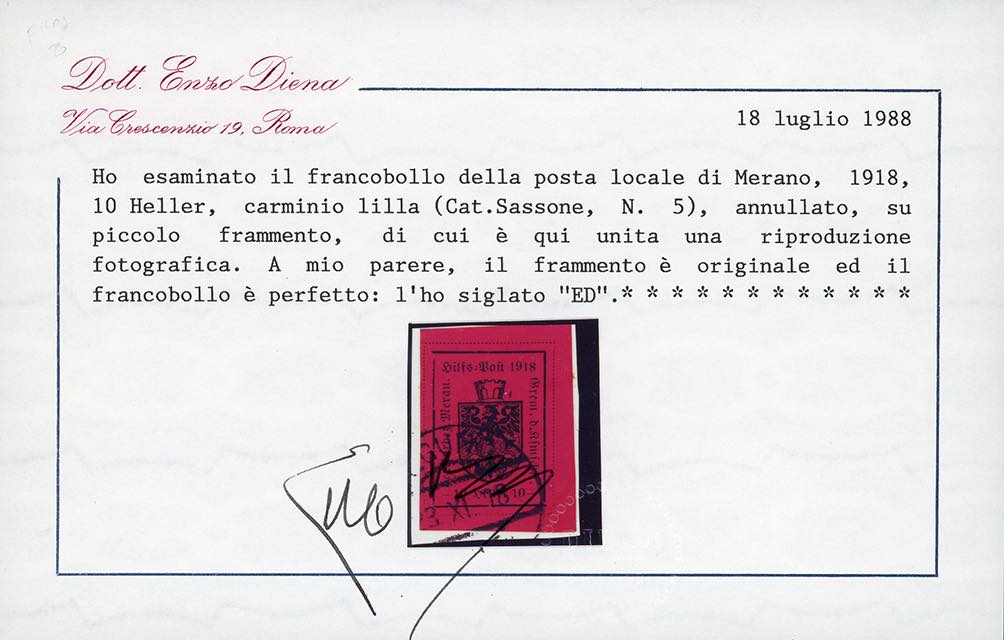MERANO 1918 - 2 h. e 10 h. I tipo (4/5), usati, perfetti. Molto belli. Ferrario, il n. 5 cent. Enzo Diena.