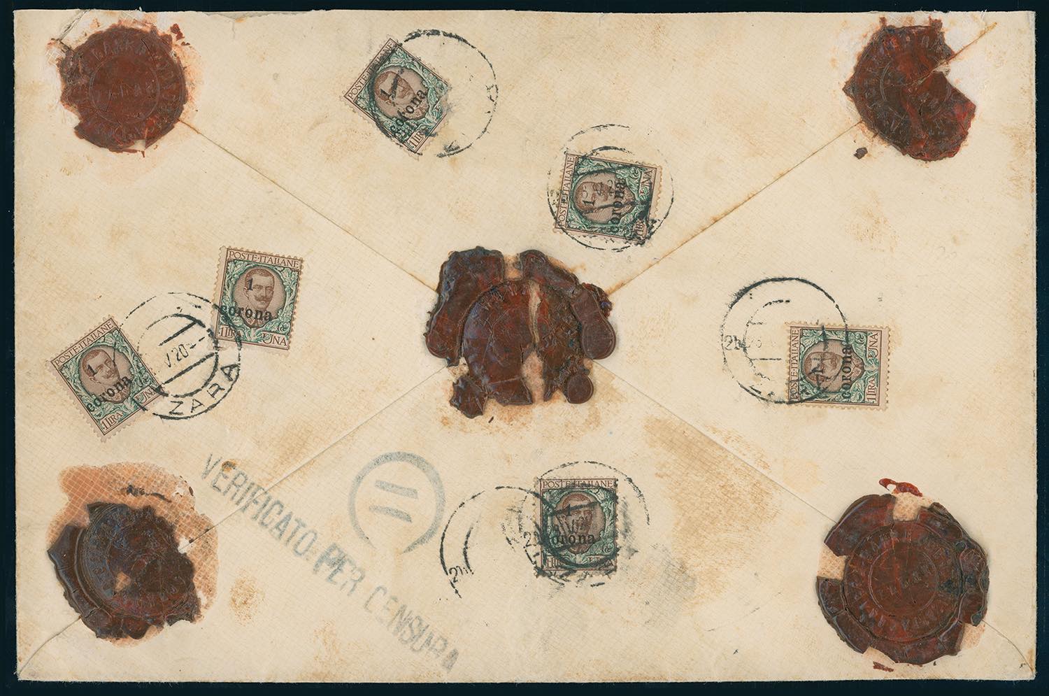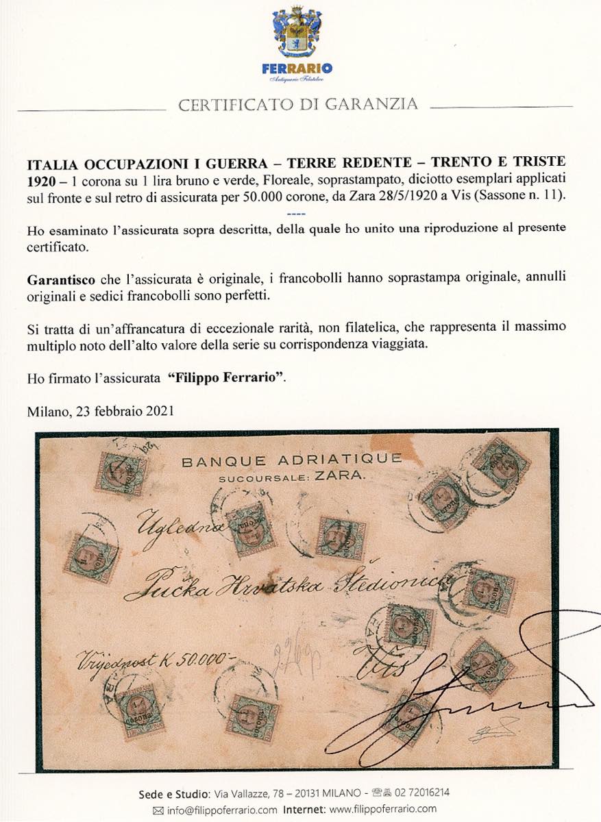 TRENTO E TRIESTE 1920 - 1 corona su 1 lira Floreale, soprastampato (11), diciotto esemplari, 16 perfetti, 2 con difetti, applicati fronte/retro su assicurata per 50.000 corone, da Zara 28/5/1920 a Vis. Straordinaria ed eccezionale affrancatura, che costituisce il massimo multiplo dell'alto valore della serie su corrispondenza viaggiata. Grande rarità, da esposizione. Cert. Ferrario.