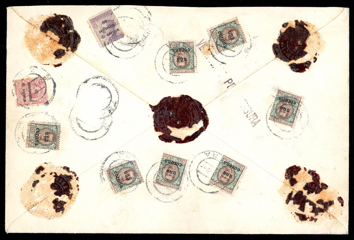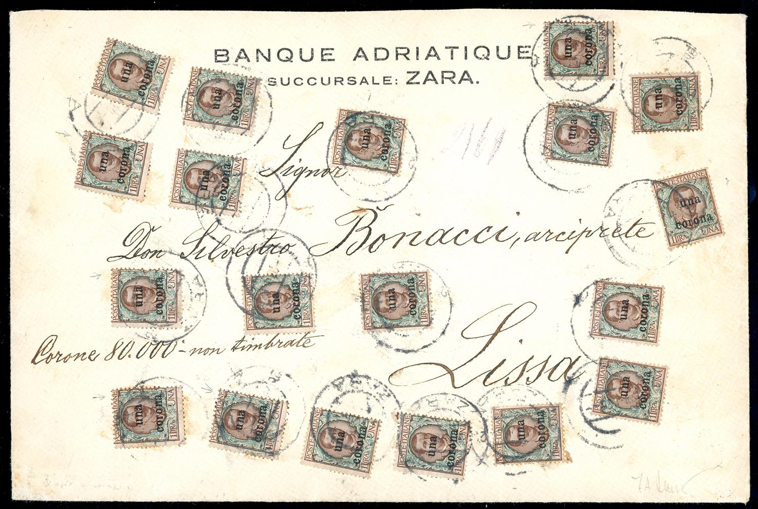 DALMAZIA 1920 - 1 cor. su 1 lira (1), 26 esemplari in affrancatura fronte/retro mista con 10 cent. su 10 cent. e 50 cent. su 50 cent. di Trento e Trieste (4,9), qualche inevitabile difetto e un francobollo staccatosi, su busta da Zara 19/1/1920 a Lissa. Si tratta della MASSIMA AFFRANCATURA NOTA di questo francobollo, tra le massime rarità del settore. F.Zanetti.