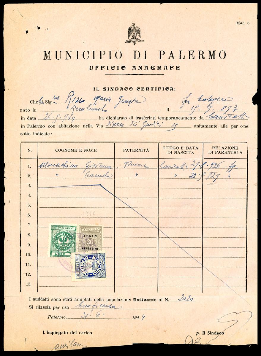 OCCUPAZIONE ANGLO-AMERICANA AMGOT SICILIA 1944 - 30 cent. (3), perfetto, in affrancatura mista con 40 cent. e 1 lira marche da bollo municipali, su certificato dell'anagrafe di Palermo del 21/6/1944. Interessante e non comune uso fiscale.
