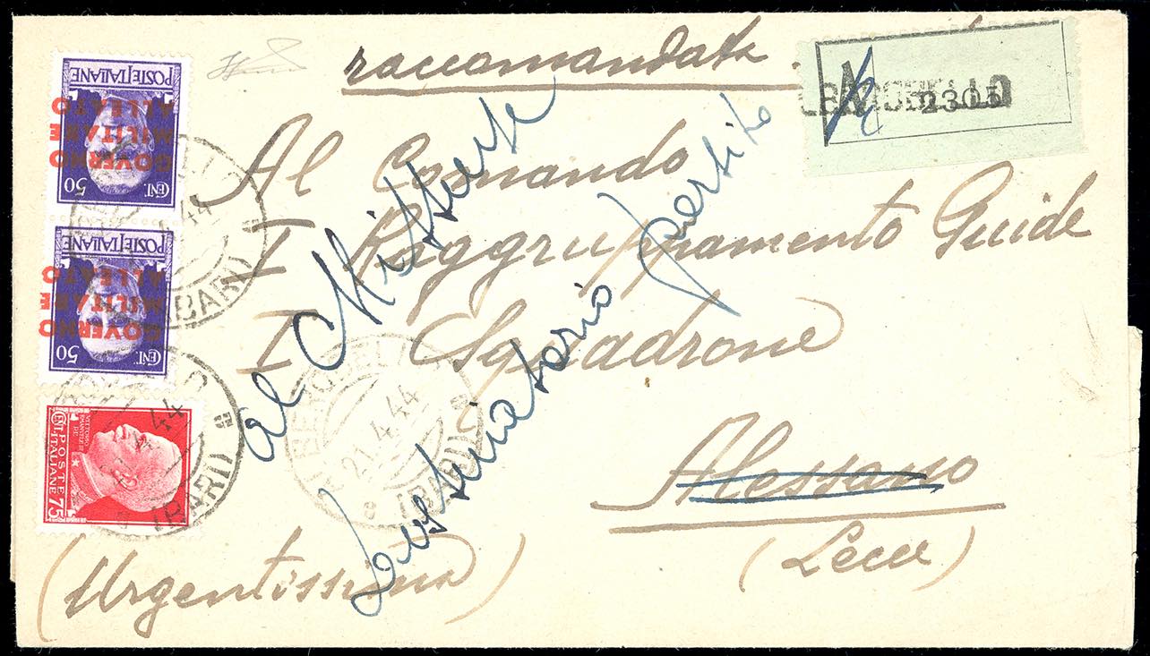 AMGOT OCCUPAZIONE ANGLO-AMERICANA NAPOLI 1944 - 50 cent, soprastampato, coppia (12), in affrancatura mista con 75 cent. Imperiale (Regno 252), perfetti, su busta raccomandata da Alberobello 21/4/1944 ad Alessano, ritornata al mittente per "destinatario partito", bolli di transito al verso. Pregevole affrancatura mista non filatelica, impreziosita dall'uso in provincia di Bari. Ferrario.