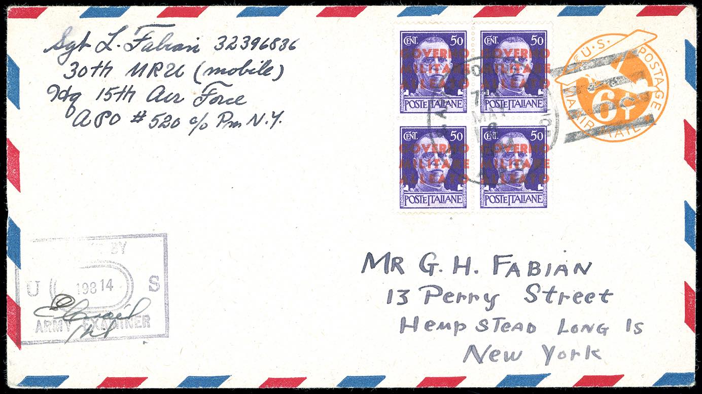 OCCUPAZIONE ANGLO-AMERICA AMGOT NAPOLI 1944 - 50 cent. soprastampato (12), blocco di quattro, perfetto, su aerogramma da 6 cent. americano dalla "APO 520 17/5/1944" a New York, negli Stati Uniti, bollo di censura.