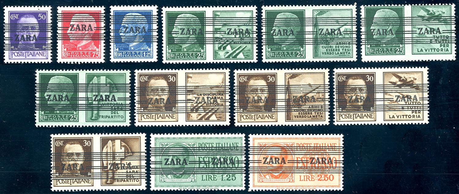 OCCUPAZIONE TEDESCA ZARA 1943 - Soprastampati "Zara" fra righe tipografiche orizzontali, serie completa (24/34+E), gomma originale integra, perfetti. A.Diena per l'E4.