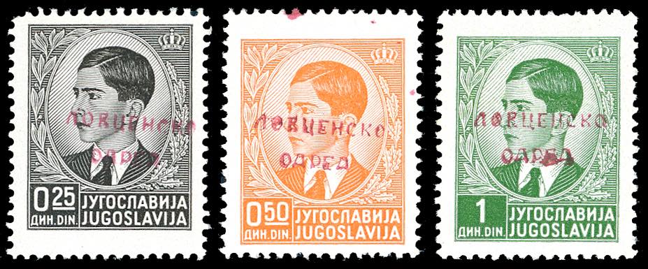 MONTENEGRO PARTIGIANI DEL LOVCEN 1941 - Soprastampati in rosso, serie completa di tre valori, gomma originale, perfetti. Belli. Ferrario, cert. Landmans.