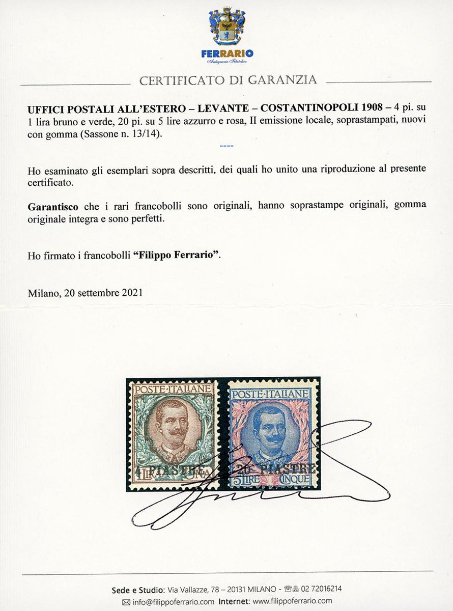 COSTANTINOPOLI 1908 - 4 p. su 1 lira, 20 p. su 5 lire II emissione locale (13/14), gomma originale integra, perfetti. Rari e di ottima ... Read more