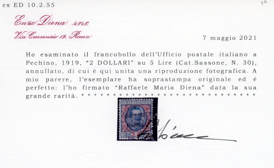 PECHINO 1919 - 2 dollari su 5 lire, soprastampa in caratteri maiuscoli (30), usato, perfetto e di ottima centratura. Splendido di eccellente qualità. Solo 15 esemplari noti tra nuovi e usati. Grande rarità della Filatelia Italiana. A.Diena, Sorani, cert. Diena e Ferrario.