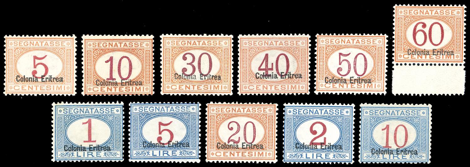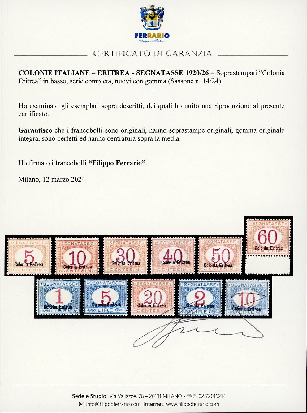 SEGNATASSE 1920/26 - Soprastampati in basso, serie completa (14/24), nuovi, gomma originale integra, perfetti. Centratura nettamente sopra la media. Ottima qualità. Cert. Ferrario (cat.Sassone € 12.000/24.000).