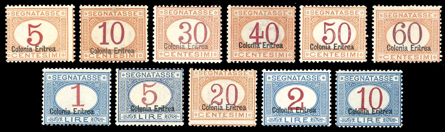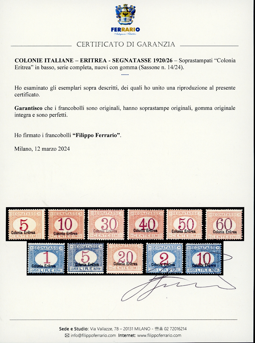 SEGNATASSE 1920/26 - Soprastampati in basso, serie completa (14/24), nuovi, gomma originale integra, perfetti. Molto freschi. Il 20 cent. cert. Chiavarello, cert. Ferrario per tutti.