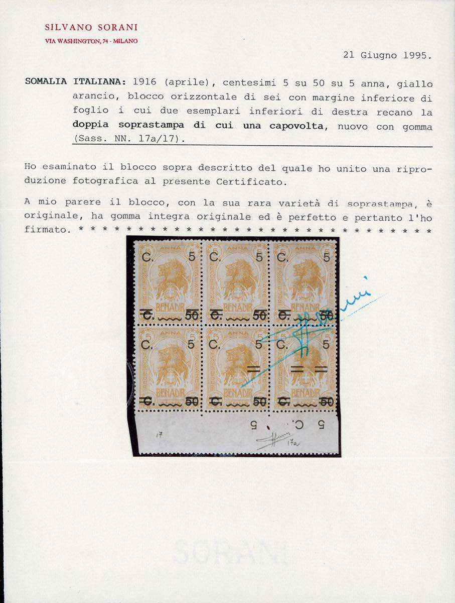 1916 - 5 cent. su 50 cent. su 5 anna, blocco di sei, due esemplari con doppia soprastampa di cui una capovolta, parzialmente ripetuta sul bordo di foglio (17a,nota), gomma originale, integra per gli esemplari con la varietà, perfetto. Insieme rarissimo, PROBABILMENTE UNICO! G.Bolaffi, cert. Sorani, Fiecchi e Ferrario.