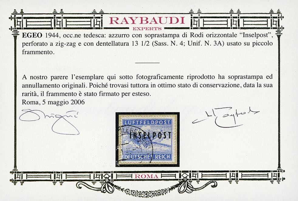 OCCUPAZIONE TEDESCA EGEO 1944 - Inselpost azzurro, emissione di Rodi, dent. 13 3/4 (4), perfetto, usato su piccolo frammento. Molto raro. Cert. Oro Raybaudi. e Petry.