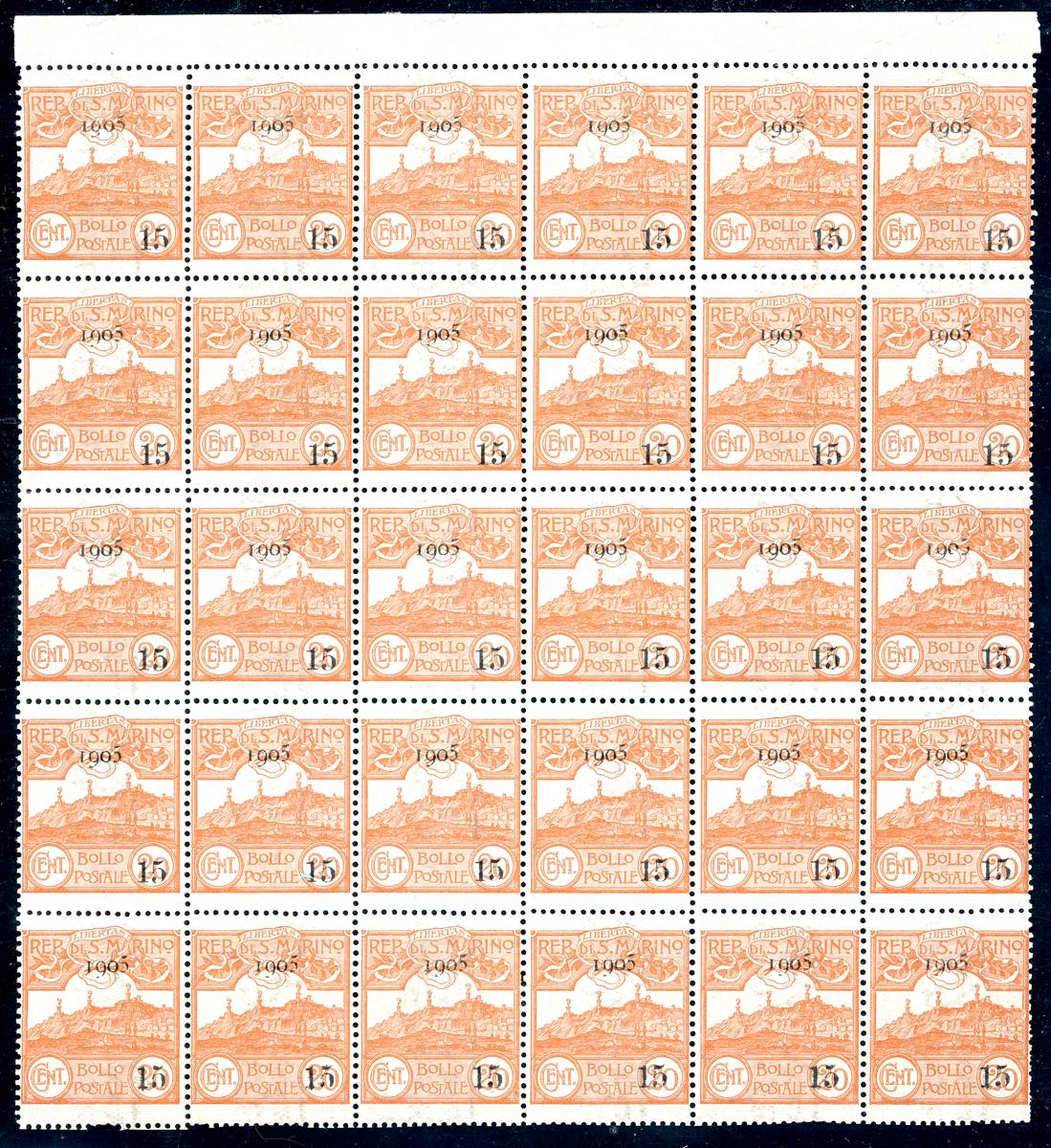 1905 - 15 cent. su 20 cent. (46), blocco di 30 esemplari, diversi con ottima centratura, gomma originale integra, perfetto.