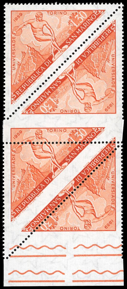 1959 - 30 lire Universiadi di Torino, striscia di quattro, la coppia centrale con la dentellatura fortemente spostata, l'esemplare bordo di foglio non dentellato da un lato (502c), bordo di foglio, gomma originale integra, perfetta. Molto rara.