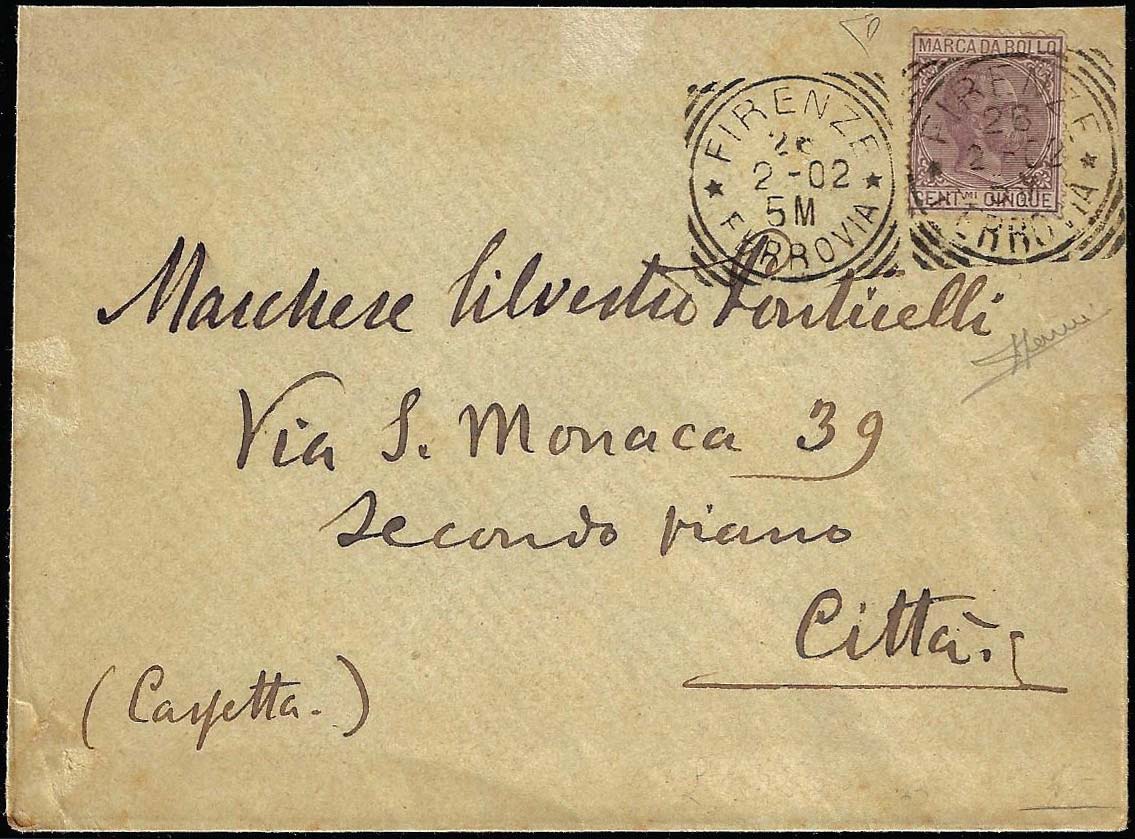 1902 - 5 cent. lilla, Umberto I Marca da bollo (Sass.9), perfetto, isolato su busta da Firenze 26/2/1902 per città. Bella. Sorani.