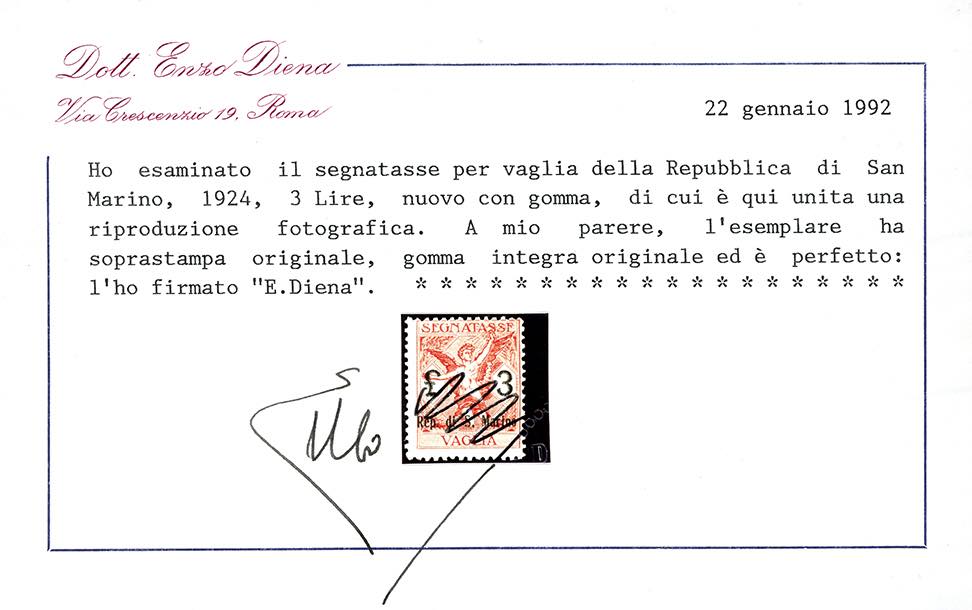1924 - Serie completa (1/6), gomma originale integra, perfetti. Rari. Tutti firmati A.Diena, cert. A. ed E.Diena, per il 3 lire. Ex coll. ... Read more