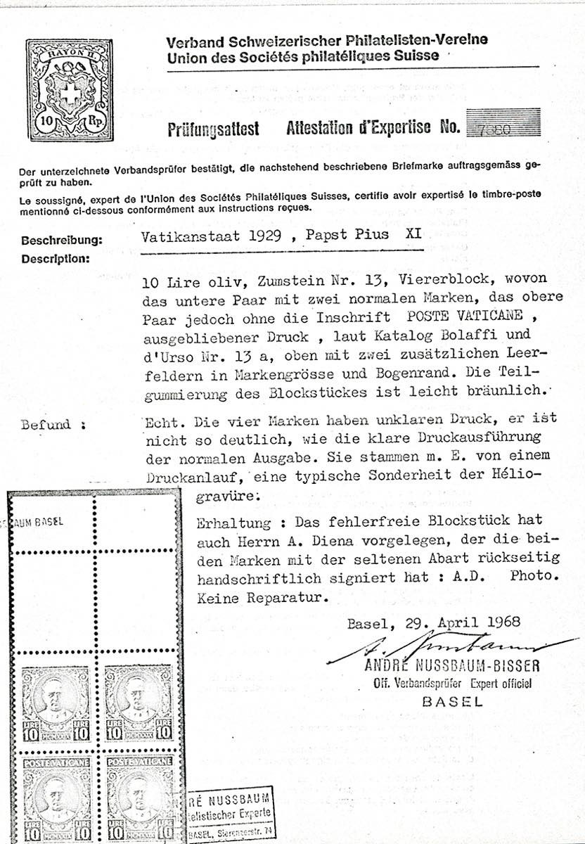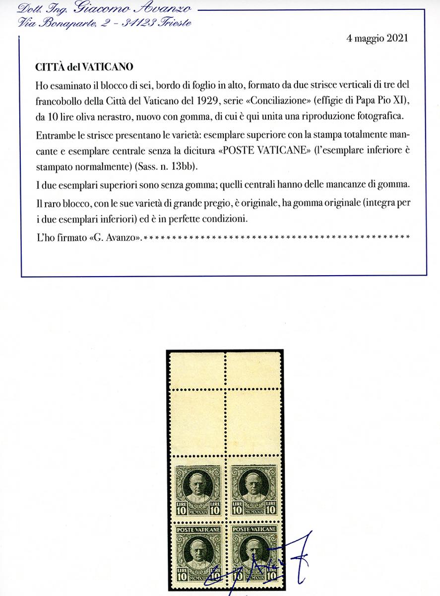 1929 - 10 lire Conciliazione, blocco di sei esemplari, i due esemplari superiori con la stampa totalmente mancante, i due centrali con stampa incompleta, senza dicitura "Poste Vaticane" (13bb), i due esemplari superiori senza gomma, i due centrali con gomma originale, perfetto. Insieme eccezionale, UNICO NOTO. Cert. Avanzo.