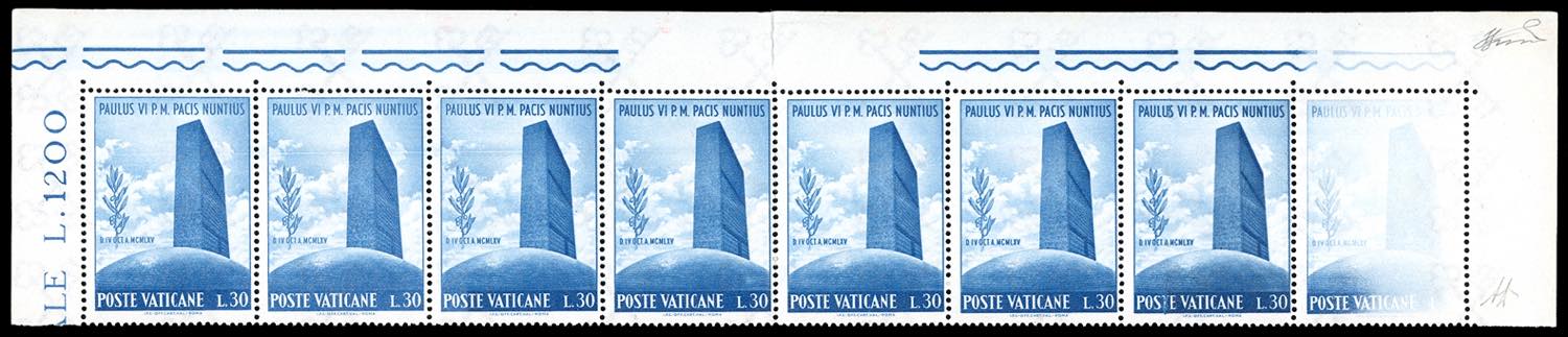 1965 - 30 lire Paolo IV all'ONU, striscia orizzontale di otto, dentellatura verticale aperta al centro, l'ultimo esemplare con stampa evanescente (417aa,nota), angolo di foglio, gomma originale integra, perfetta. Rara varietà, di grande impatto visivo, solo 5 esistenti. A.Diena, cert. Ferrario.