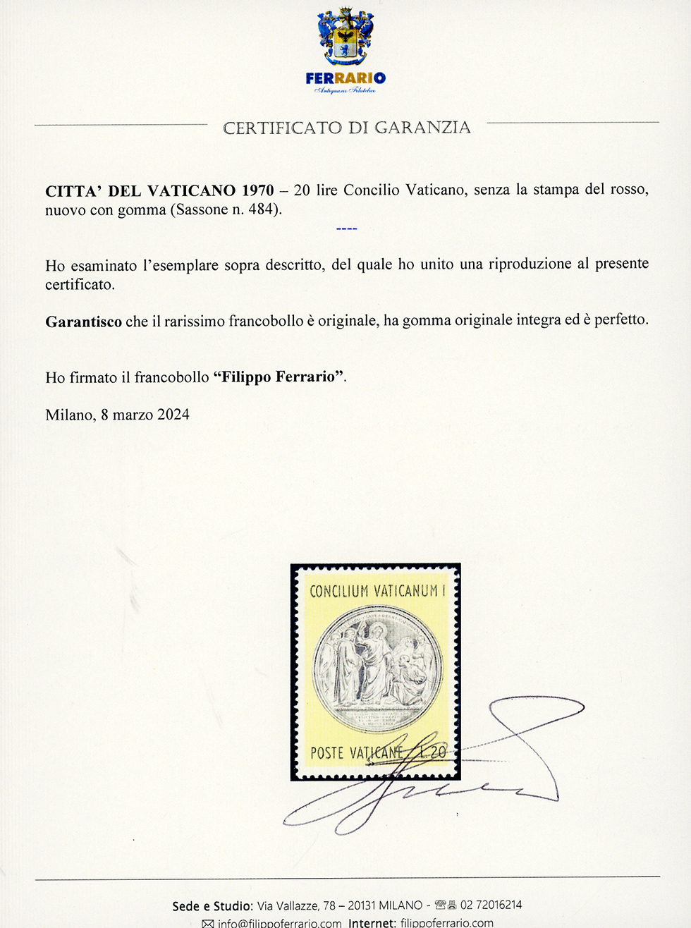1970 - 20 lire Concilio Vaticano, senza la stampa del rosso (484), gomma originale integra, perfetto. Varietà rarissima e non catalogata. Fotocopia cert. Raybaudi della coppia di provenienza, cert. Ferrario.