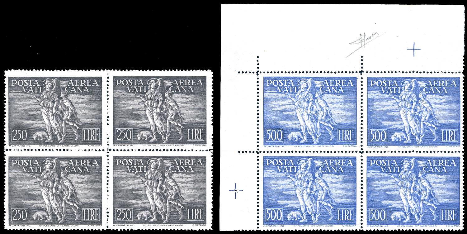 1948 - Tobia, serie completa (16/17), ottima centratura, blocchi di quattro, il 500 lire angolo di foglio, gomma originale integra, perfetti. Cert. Sorani.