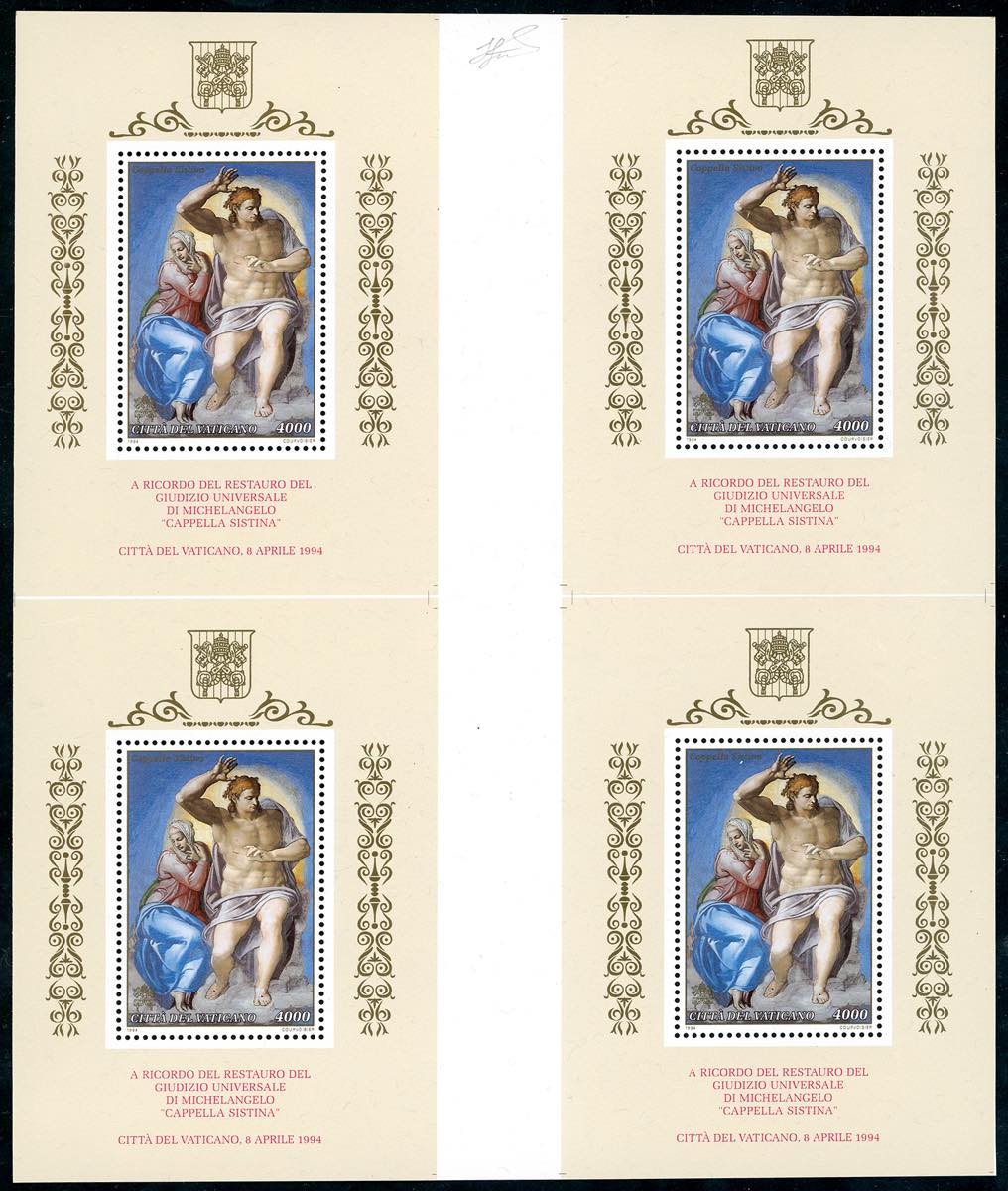 1994 - 4.000 lire Cappella Sistina di Michelangelo (20), blocco di quattro, foglietti non separati con grande interspazio verticale, gomma ... Read more
