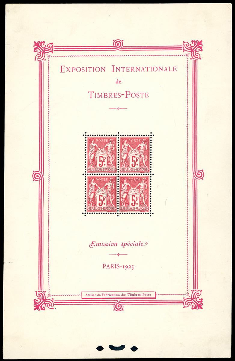 FRANCIA FOGLIETTI 1925 - 5 fr. Esposizione filatelica di Parigi, foglietto (BF1), gomma originale, integra per i francobolli, leggera traccia di linguella solo sui bordi, perfetto, piccolo taglietto sul lato sinistro.