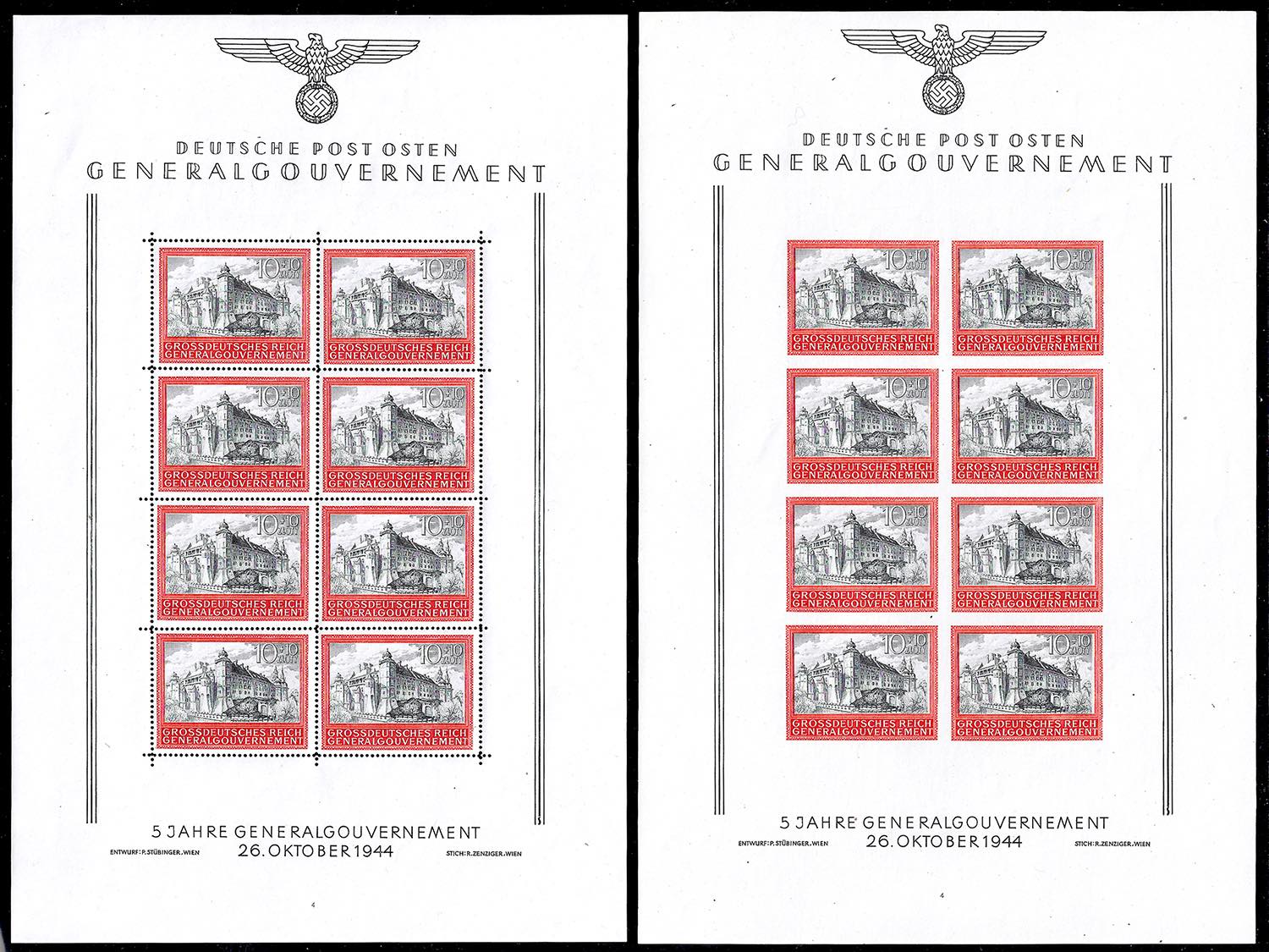 GERMANIA OCCUPAZIONE POLONIA FOGLIETTI 1944 - Castello di Cracovia, un foglietto dentellato e uno non dentallato (BF3), gomma originale integra, perfetti. Belli. Ex coll. Romano.