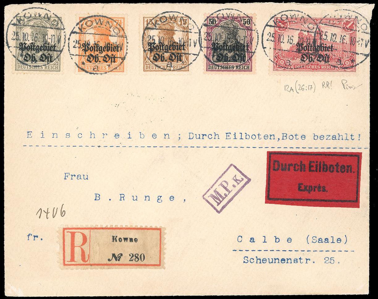 GERMANIA OCCUPAZIONE RUSSIA 1916 - 1 m. soprastampato, dent. 26:17 fori (Mi.12A), con complementarei (Unif.1,4,6,11), perfetti, su busta raccomandata espresso da Kaunas 25/10/1916, in Lituania, a Calbe. Molto rara.