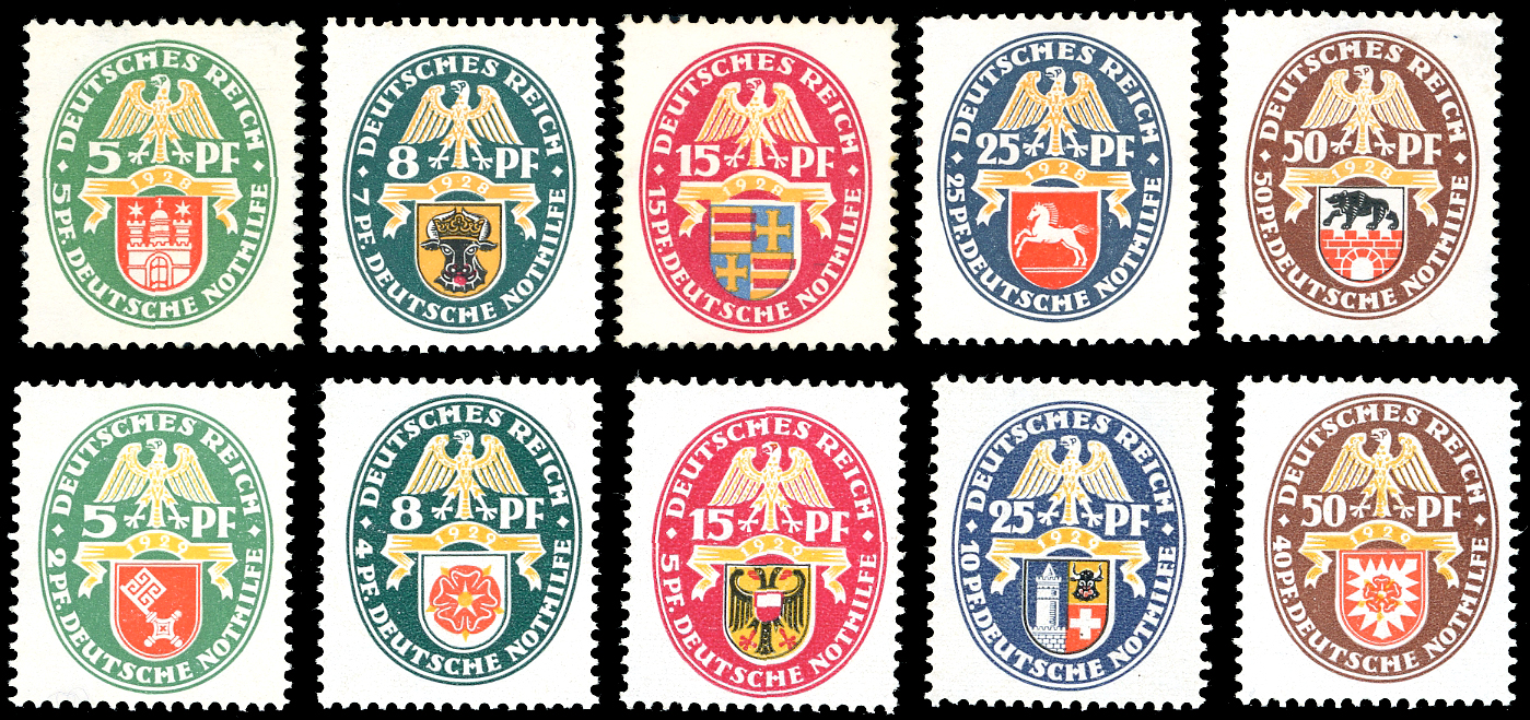 GERMANIA REICH 1928/29 - Stemmi regionali, serie complete con millesimi 1928 e 1929 (416/420, 421/425), gomma originale integra, perfetti. Ex coll. Romano.