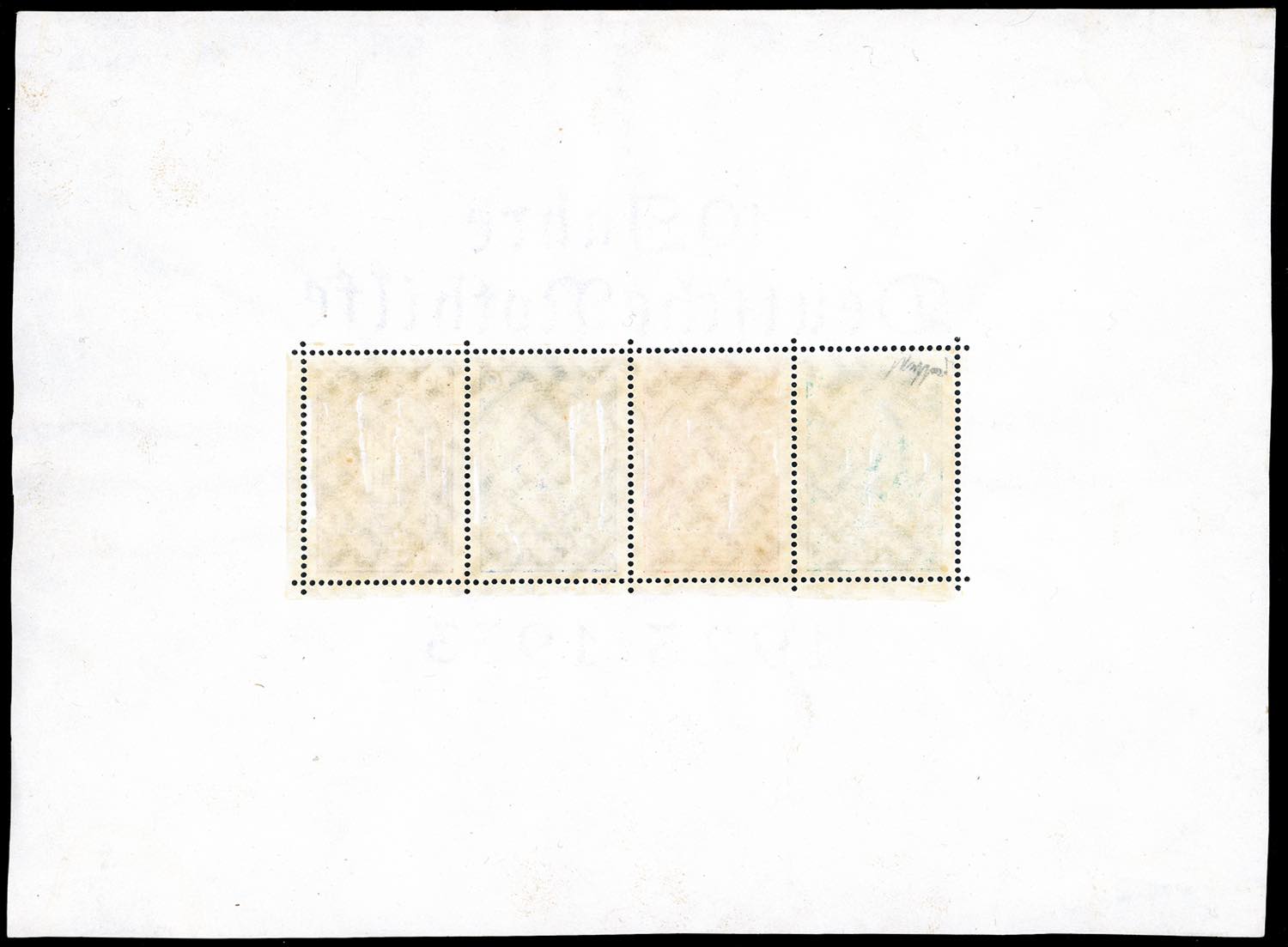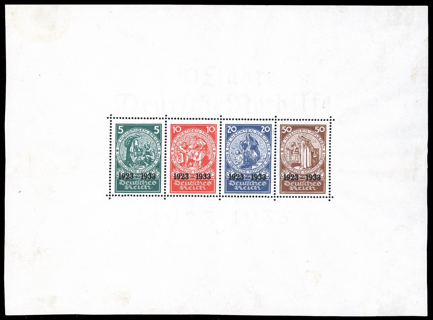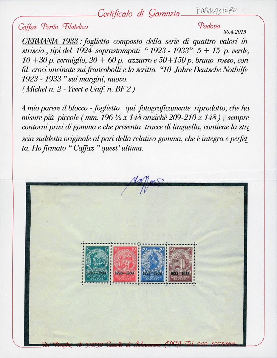 GERMANIA REICH 1933 - Santa Elisabetta soprastampati, serie completa in foglietto di dimensioni ridotte (479/482), gomma originale integra, perfetti. Quotazione di catalogo riferita alla serie di 4 francobolli (e non al foglietto), venduta come tale. Cert. Caffaz. Ex coll. Romano.