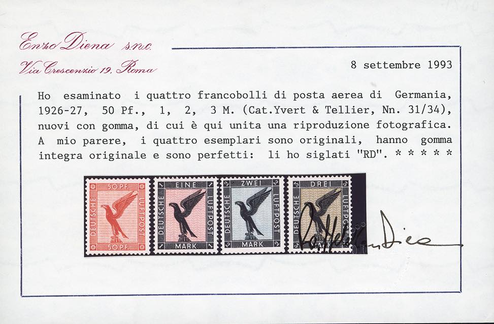 GERMANIA REICH POSTA AEREA 1926/27 - Serie completa (A27/A34), gomma originale integra, perfetti e molto freschi. Cert. Diena per gli alti valori. Ex coll. Romano.