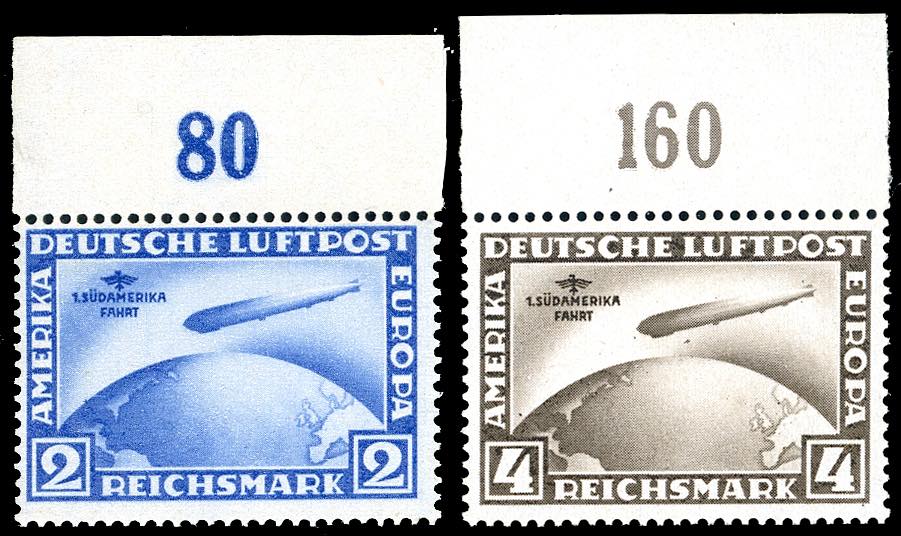 GERMANIA REICH POSTA AEREA 1930 - Zeppelin Sudamerika Fahrt, serie completa (A38/A39), bordo di foglio, gomma originale integra, perfetti e molto freschi. Cert. Caffaz. Ex coll. Romano.