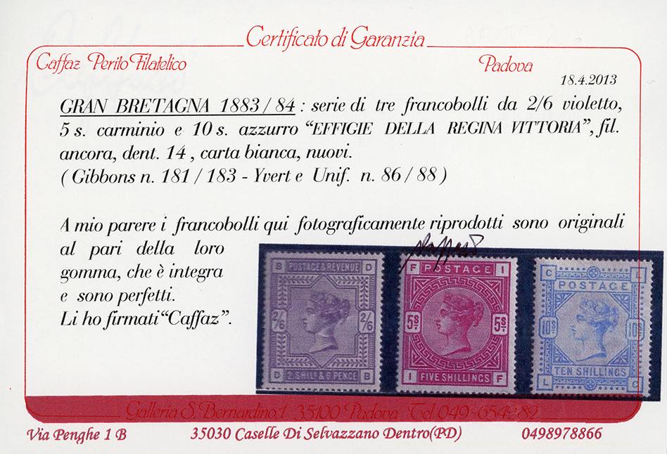 GRAN BRETAGNA 1883/84 - Alti valori Regina Vittoria, serie completa (86/88), gomma originale integra, MNH, perfetti e molto freschi. Cert. ... Read more