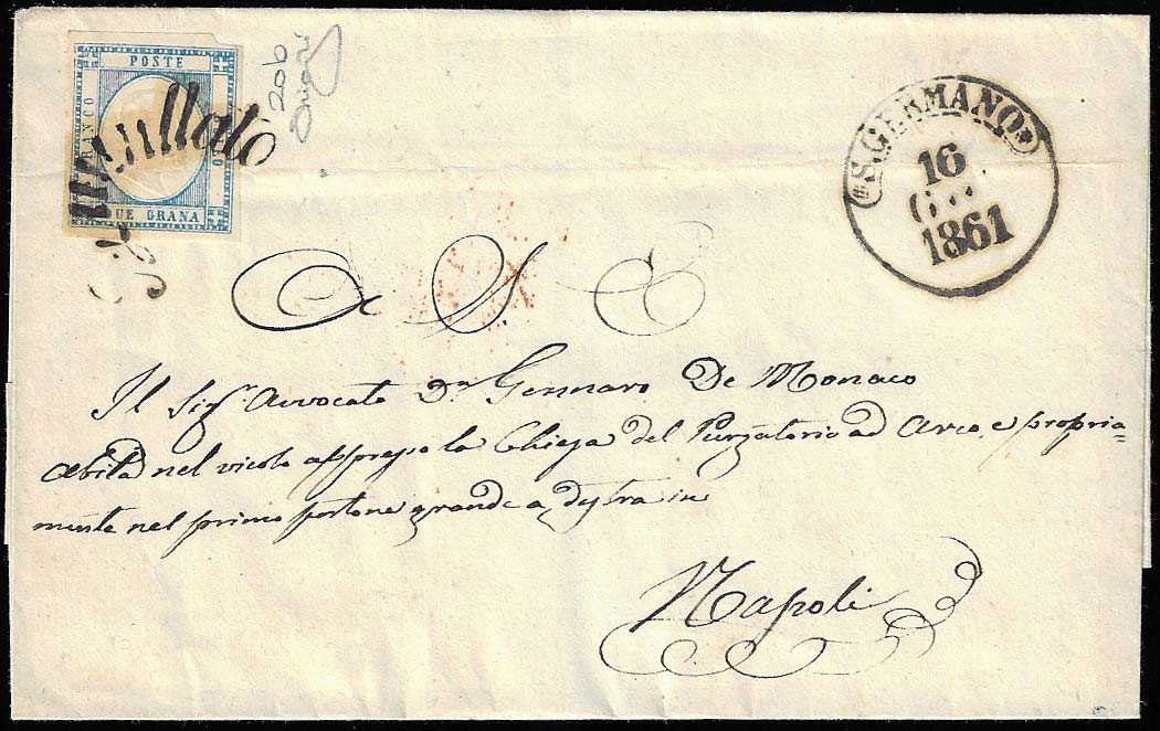 S.GERMANO, svolazzo + cerchio punti 13 - 2 grana (20), lieve piega orizzontale, su sovracoperta di lettera del 16/6/1861 per Napoli. Raro annullo, molto nitido. Cert. Raybaudi.