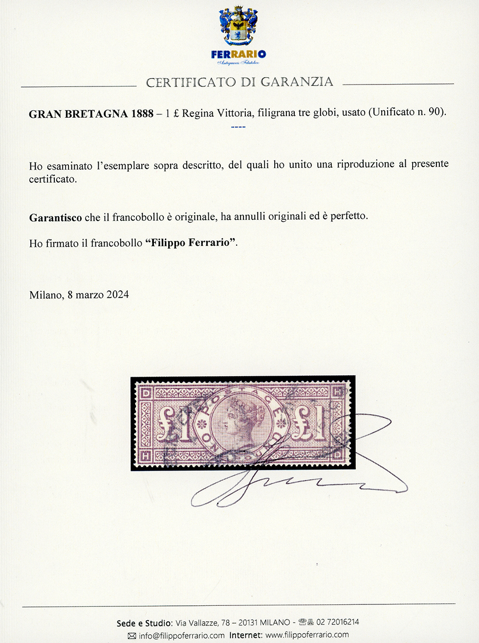 GRAN BRETAGNA 1888 - 1 £ Regina Vittoria, filigrana tre globi (90), usato, perfetto. Molto bello. G.Bolaffi, A.Diena, cert. Ferrario.