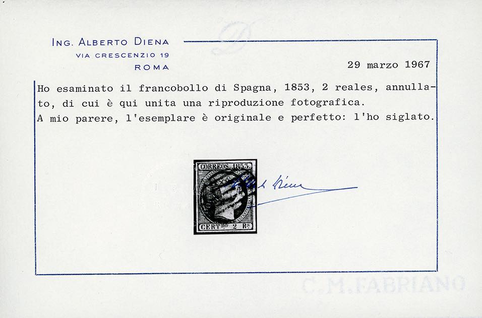 SPAGNA 1853 - 2 r. Isabella II (12), usato, perfetto. Molto bello. Ferrario, cert, A.Diena.